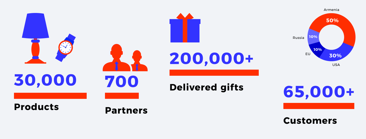 4u.am has more than 150 partners, mainly Armenianproducers of gifts and sweets, flower shops, various companies offering “experience as a gift” services (romantic dinners, serenades, magicians, etc.).